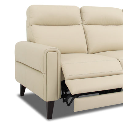Meet the Crafton Incliner Sofa Left in Cream Leather, a perfect blend of Mid-Century Modern style and advanced comfort. This power incliner, upholstered in genuine leather, features a deep seat and high back for an extraordinarily pleasant experience, whether sitting or reclining. The HR level foam ensures lasting support, while the sinuous wire suspension and Pirelli webbing enhance the sofa's superior comfort. Featuring a kiln-dried, corner-blocked wood frame with dark walnut finish and solid tapered legs for easy robot vacuum access. Over time, the cream leather gracefully ages, developing a rich vintage patina. Kid and pet-friendly, it's designed for durability and timeless style.