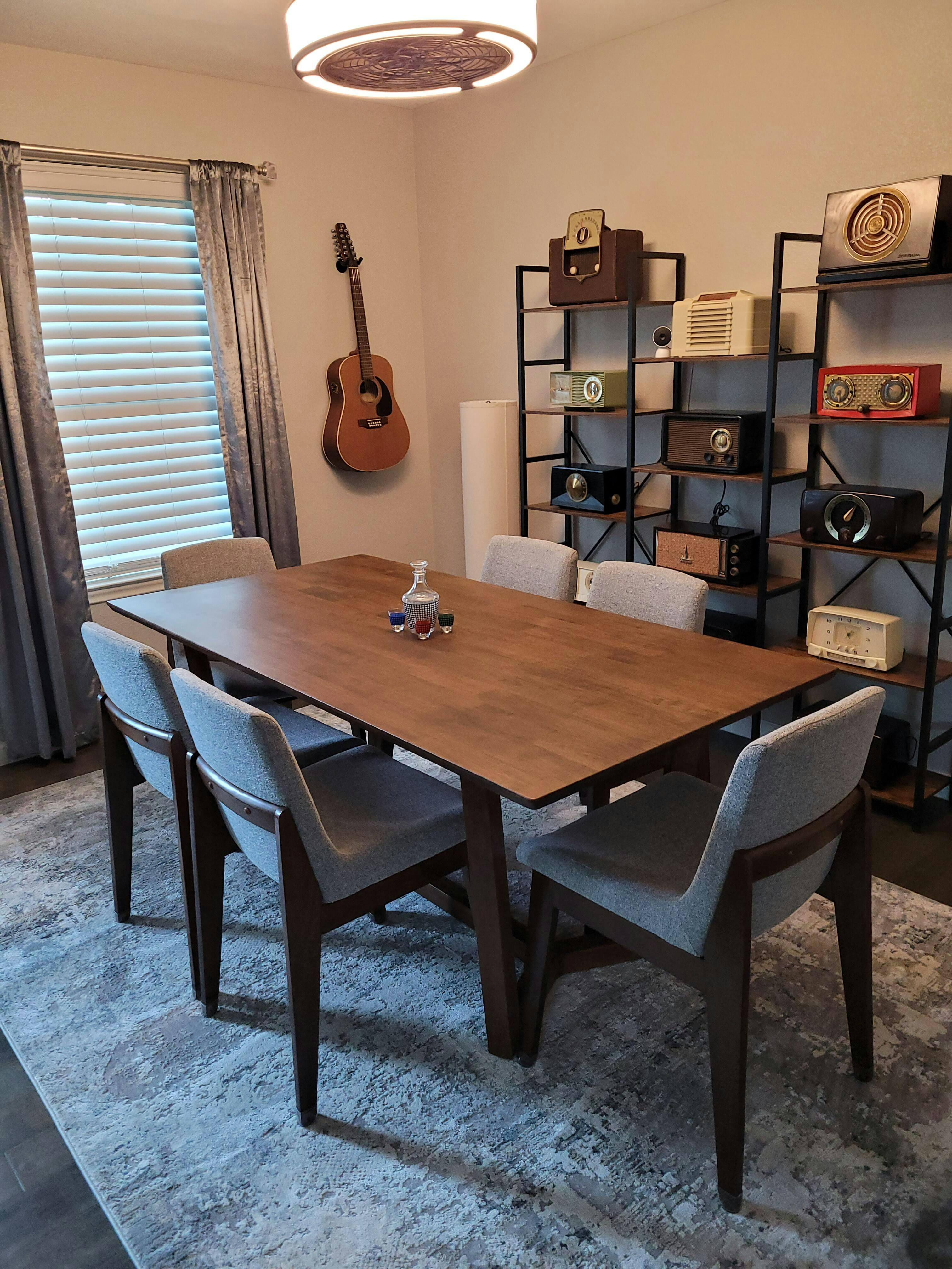 The Rolda mid-century modern design large dining table. Crafted from solid wood in a walnut color, it promises durability for lasting use. Perfect for family gatherings or game nights with friends, it offers both affordability and durability. ıt can accomadate up to 6 people. The Rolda Rectangular Dining Table is a simple and durable designed dining table. This dining table invites the whole gang to gather around, enjoy a meal and linger for dessert and conversation. Each gorgeous, natural oak tabletop is unique and rustic, for a casual backdrop to all your favorite meals.
